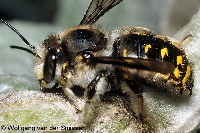 Die Wildbiene des Jahres 2014: Mit den kräftigen Dornen am Hinterleib versucht das Wollbienenmännchen