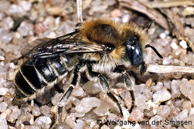 | Die kleine Mohn-Mauerbiene Osmia papaveris (8-11 mm) ist eine sehr seltene vom Aussterben bedrohte Wildbiene. Nicht allein die großen Bestände ihrer bevorzugten Pflanze verschwinden. Es ist ihr Lebensraum, der immer mehr eingeengt wird. Wir haben sie im Juni 1995 in Gmünda (Bayern) noch in ihrem typischen Lebensraum beobachten können (siehe unten). |