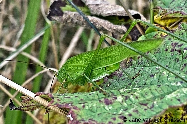 | Das Weibchen der Sichelschrecke Phaneroptera falcata. Die nördlichsten Fundpunkte lagen nach Bellmann (1985) im Vogelsberg bei Köln. Infolge der Klimaerwärmung hat sich die Sichelschrecke jetzt bis nach Schleswig-Holstein ausgebreitet (Nachweise von Phaneroptera falcata in Deutschland ab 1990 © DGfO). Wir fanden sie am Wegrand eines Trockenrasengebietes im Norden Lübecks (HL-Siems 11.09.2020). |